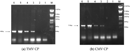 RT-PCR analysis of the TMV CP gene (a) and CMV CP gene (b). The expected size of the amplified portion of the TMV CP gene transcript were observed in LBA-1, LBA-2 and LBA-3; a fragment of ca. 713 bp, corresponding to the amplified portion of the CMV CP gene transcript were observed in LBA-1 and LBA-2, but absent in LBA-3. M: Marker; 1: Control (ddH2O); 2: PCR product of 85-5; 3: PCR product of LBA-1; 4: PCR product of LBA-2; 5: PCR product of LBA-3; 6: PCR product of pCAM-TM35SCM.