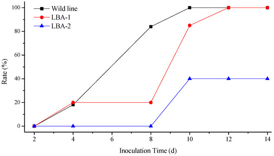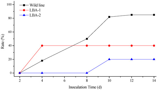 The illness conditions of test plants were linked to the virus inoculation concentration. High virus concentration causes serious Rehmannia glutinosa illness, and even death. On the contrary, the illness maybe too light to evaluate illness conditions when the virus concentration is too low, so the best inoculation concentration of TMV and CMV was investigated before the virus resistance test (Supplementary Table S5). Finally, 0.1 μg/mL of virus was selected as the optimum concentration. Figure 4 shows the incidence of Rehmannia glutinosa infected by TMV. The incidence rate of LBA-1 and LBA-2 was significantly less than in the wild line within 8 days after inoculation. LBA-2 maintained a low incidence for more than 10 days. However, all the LBA-1 and wild line Rehmannia glutinosa plants suffered TMV disease after 8 days. The disease index test was also determined in order to investigate the TMV resistance of Rehmannia glutinosa according to grade and tobacco disease investigation method of (Industry criteria of the tobacco industry of China, YC/T 39-1996). The disease indexes of LBA-1, LBA-2 and wild type Rehmannia glutinosa were 42.9, 37 and 15, respectively. LBA-2 was thus classified as a resistant plant (5 < disease index ≤ 20), which showed excellent resistance to TMV virus. LBA-1 was a medium resistance plant (20 < disease index ≤ 40), which TMV resistance was slightly higher than that of the wild type (susceptible plant, 40 < disease index ≤ 60). The same experiment was performed on CMV resistance of Rehmannia glutinosa. LBA-1 showed CMV disease symptoms soon after CMV inoculation, but showed a significantly lower incidence compared with wild type Rehmannia glutinosa during the observation time, as shown in Figure 5. The CMV disease incidence of LBA-2 was lower than that of LBA-1 and the wild lines. In addition, LBA-2 was a resistant plant (disease index = 10), and LBA-1 was a medium resistance plant (disease index = 30). We also compared the symptoms of Rehmannia glutinosa leaves 10 days after inoculation with the virus (Figure 6 and Figure 7).