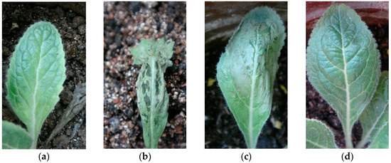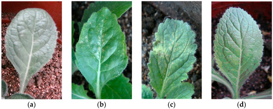 Symptoms of Rehmannia glutinosa leaves 10 days after inoculation with CMV. (a) control; (b) wild line; (c) LBA-1; (d) LBA-2.