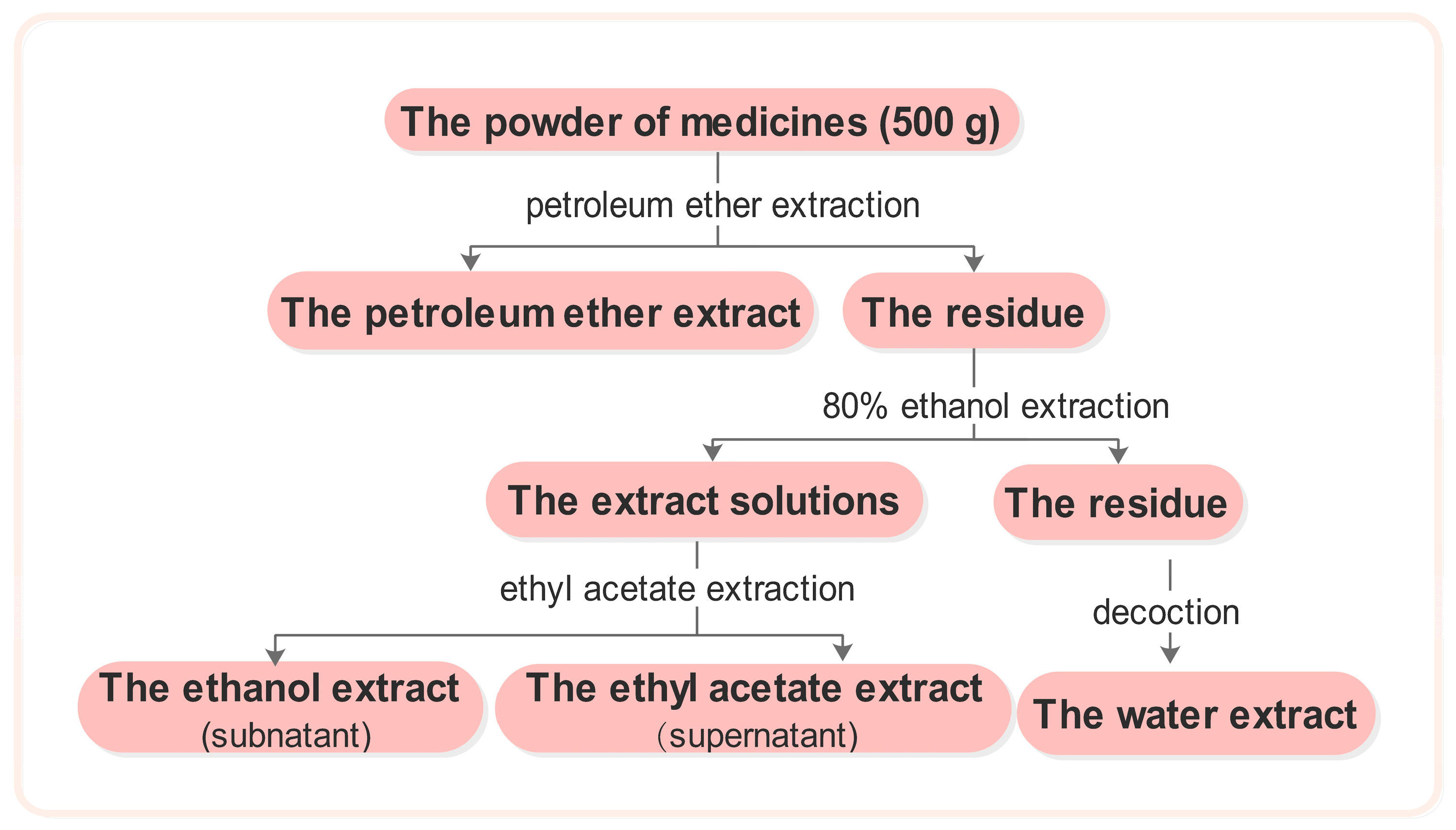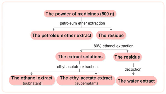 The medicinal plant material was crushed into coarse powder. Five hundred grams of powder was soaked in petroleum ether for 24 h, after which a percolation extraction was performed. The filter was retrieved and the petroleum ether was evaporated. The residue was washed with 80% ethanol and subjected twice to reflux extraction with triple the volume of 80% ethanol. The extract solutions were then combined and ethanol was reclaimed at reduced pressures until no alcohol was detected. Extraction was then performed twice with an equal volume of ethyl acetate. The upper solution was then extracted and concentrated to obtain the ethyl acetate extract, whereas the lower solution was concentrated to dryness to yield the ethanol extract. The residue was evaporated to dryness and was then extracted twice with an amount of water equal to triple the mass of the materials. The aqueous extract solutions were combined and concentrated to dryness, and the water extract was then obtained (Figure 1).