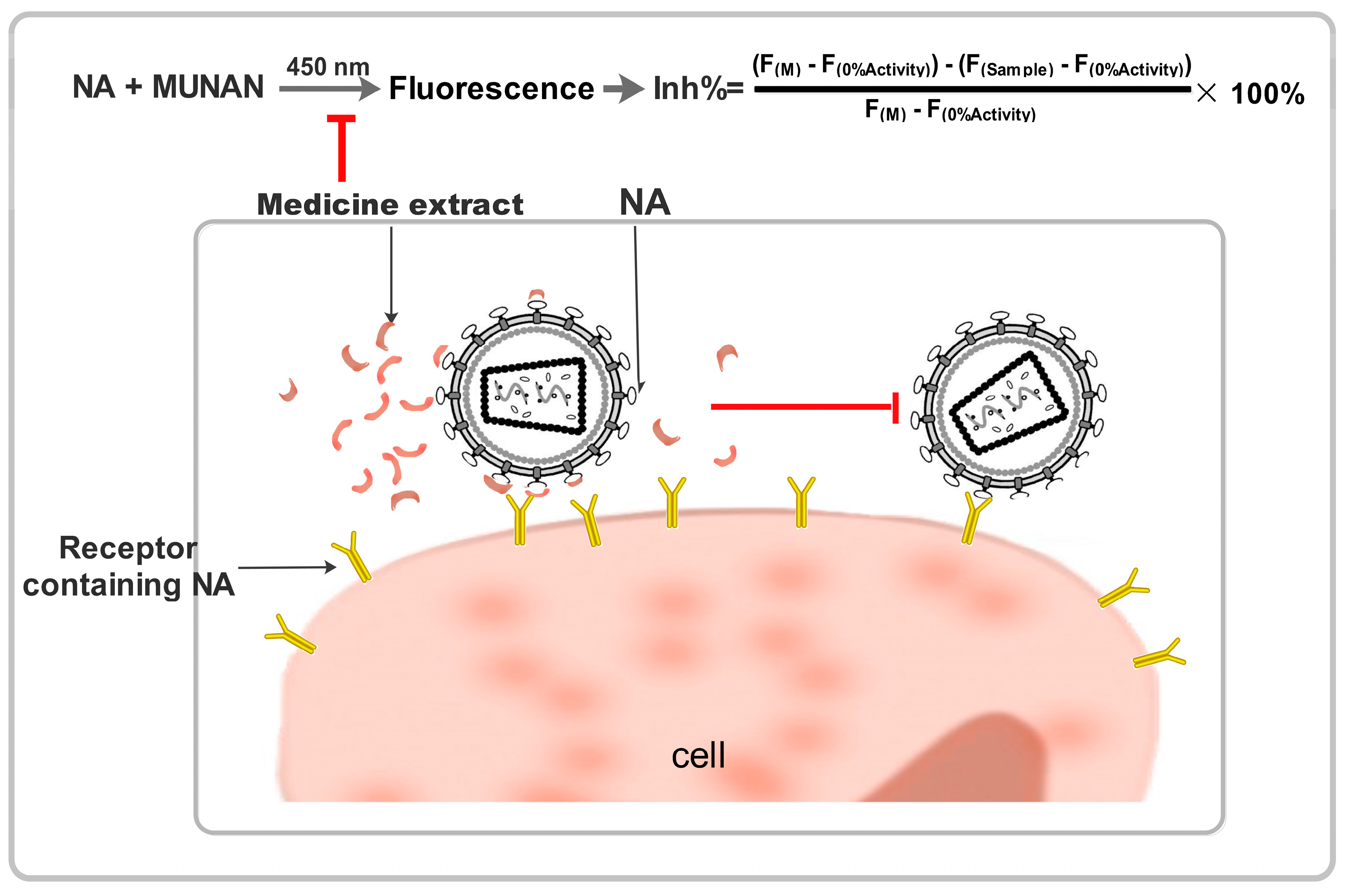 The substrate 2’-(4-methylumbelliferyl)-α-D-N-acetylneuraminic acid (MUNANA) was combined with oseltamivir or traditional Chinese medicine extracts to examine influenza virus NA activity using a standard fluorimetric assay. In this assay, the substrate and NA reacted to yield a fluorescent product that could be quantified [6,18] (Figure 2).