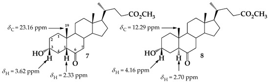 Compound 7 was readily isomerized (94.4% yield) under acid conditions (2.5% HCl/MeOH) to give the derivative 8 possessing 5α-cholestan-6-one skeleton [8,13,32]. This isomerization reaction can be performed under alkaline conditions as well, but under these conditions the obtained compound was isomerized and hydrolyzed (carboxylic acid) with 84% yield [31]. Thus, to get 8, an additional esterification reaction was carried out with 94% yield. The physical properties, IR, and 1H-NMR spectroscopic data of compound 8 have been previously reported, but the signals of 13C-NMR were not assigned [32]. The change of the 5β-cholestan to 5α-cholestan skeleton (A/B ring cis for trans fusion) implies a very important structural modification, and therefore a detailed analysis of NMR spectroscopic data for compounds 7 and 8 must be performed. The main differences found in the 1H- and 13C-NMR data are shown in Figure 2. The signals corresponding to H-3β and H-5α (δH = 4.16 and δH = 2.70 ppm, respectively) in compound 8, are displaced to downfield as compared to compound 7 (δH = 3.62 and δH-5β = 2.33 ppm, respectively). On the other hand, the signal of CH3-19 in the 13C-NMR of compound 8 appears at a higher field (δC = 12.29 ppm) than in the spectrum of compound 7 (δC = 23.16 ppm).