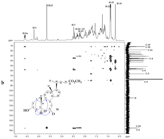 A similar analysis was performed for the structure determination of 6-oxolactone 16; thus, in the 1H-NMR spectrum for 16 a signal at δH = 4.60 ppm (dd, 1H, J = 5.3 and 11.3 Hz) was observed, correlated by 2D 1H-13C HSQC with the signal at δC = 79.65 ppm (C-7) with impair multiplicity (from DEPT-135 analysis) and assigned to H-5α. Additionally, H-5 α showed 2JHC correlation with signals at δC = 35.63 ppm and 3JHC correlation with signals at δC = 11.53, δC = 57.97 and δC = 175.35 ppm, which were assigned to the carbons C-4, CH3-19, C-9 and C-6 (C=O, of lactone function), respectively (Figure 3b).