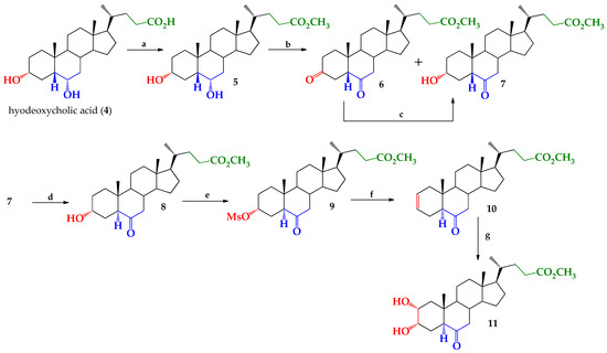 Bile acids, such as deoxycholic (1), chenodeoxycholic (2), cholic (3) and hyodeoxycholic (4) (Figure 1), have been used as substrates for the synthesis of a large number of brassinosteroid analogues, keeping the methyl ester or carboxylic function in the side chain [1,2,3,4,5,6,7]. In particular, hyodeoxycholic acid (4) has been used because it contains the modifiable organic functions at suitable positions, satisfying the structural requirements on the A and/or B and A/B trans fusion ring and side chain of active brassinosteroids [8,9,10,11,12,13,14,15,16,17,18,19,20,21,22,23,24,25,26]. Hyodeoxycholic acid (HDA) extracted from hog bile was initially used as a precursor for steroid synthesis [27]. It has also been shown that HDA prevents cholesterol-induced gallstones in animals fed with a lithogenic diet [28], whereas oral administration of HDA leads to a decrease in the LDL-cholesterol concentration, a strong stimulation of hepatic cholesterol biosynthesis and an excessive loss of cholesterol in feces [29].