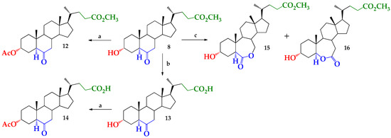 Synthesis of hyodeoxycholic acid derivatives 8, 12–14 and known 7-oxalactone 15 and 6-oxalactone 16. Reagents and conditions: (a) Ac2O/DMAP, CH2Cl2/py, r.t., 30 min; (b) K2CO3/CH3OH, reflux, 1 h; (c) m-CPBA/CH2Cl2, NaHCO3 r.t., 24 h.
