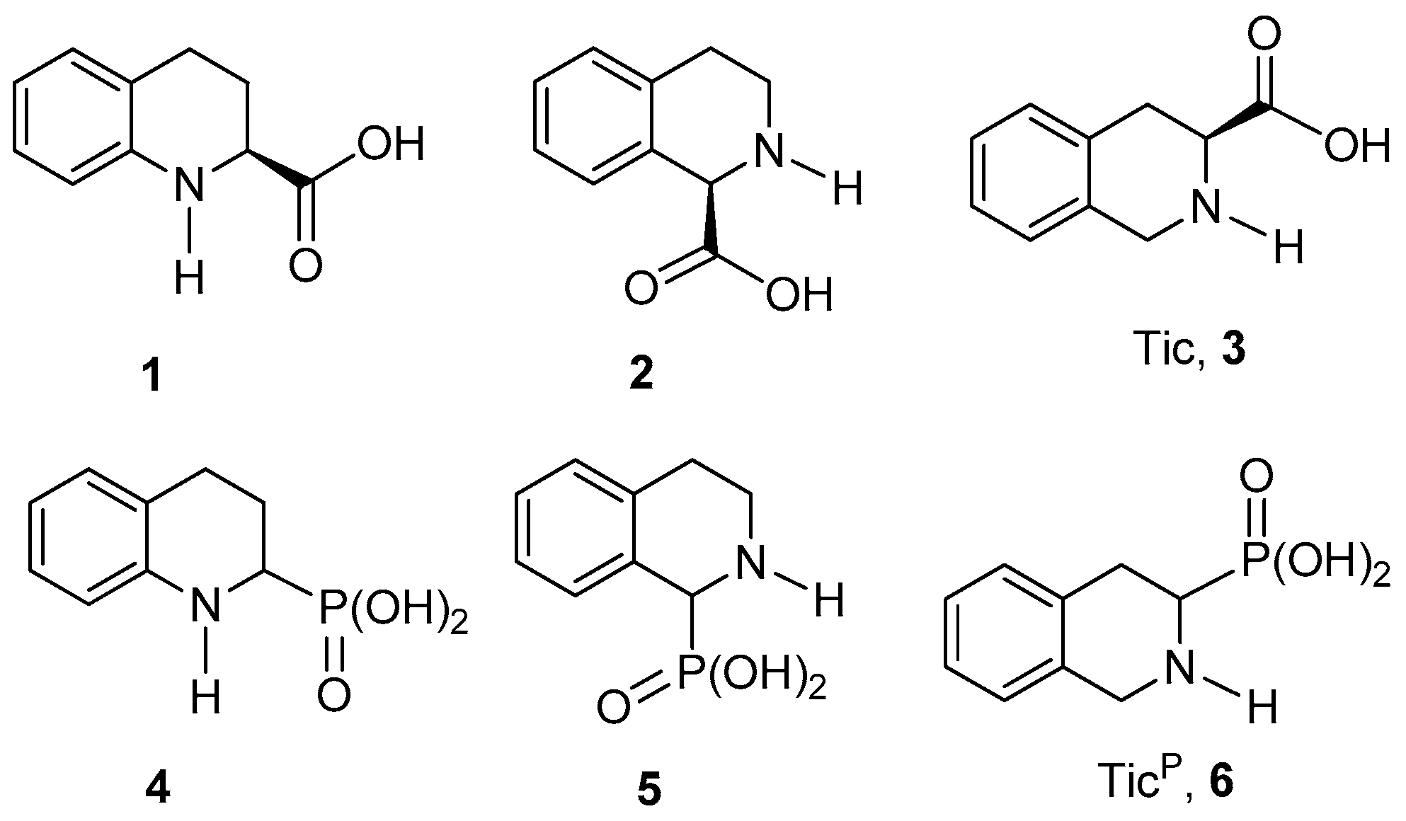 On the other hand, the α-aminoalkylphosphonic acids are probably the most important analogues of the α-amino acids, obtained by isosteric substitution of the planar and less bulky carboxylic acid (CO2H) by a tetrahedral phosphonic acid functionality (PO3H2). This class of compounds is currently attracting interest in organic and medicinal chemistry, due to their important biological and pharmacological properties [9,10,11,12]. The great importance of this type of compound has prompted organic chemists to report numerous procedures for their racemic or stereoselective synthesis [13,14,15,16,17,18], principally using the diastereoselective and enantioselective Pudovik [19,20] and Kabachnik–Fields [21,22,23,24,25] reactions for acyclic α-aminoalkylphosphonates, and through N-acyl iminium ions for the synthesis of cyclic derivatives [26,27,28,29,30,31,32,33,34]. However, to the best of our knowledge, the synthesis of 1,2,3,4-tetrahydroquinoline-2-phosphonic acid 4 and 1,2,3,4-tetrahydroisoquinoline-1-phosphonic acid 5 analogues [35,36,37,38] has not yet been described in the literature, whereas the synthesis of 1,2,3,4-tetrahydroisoquinoline-3-phosphonic acid 6 has been recently described by our research group [39,40] (Figure 1).
