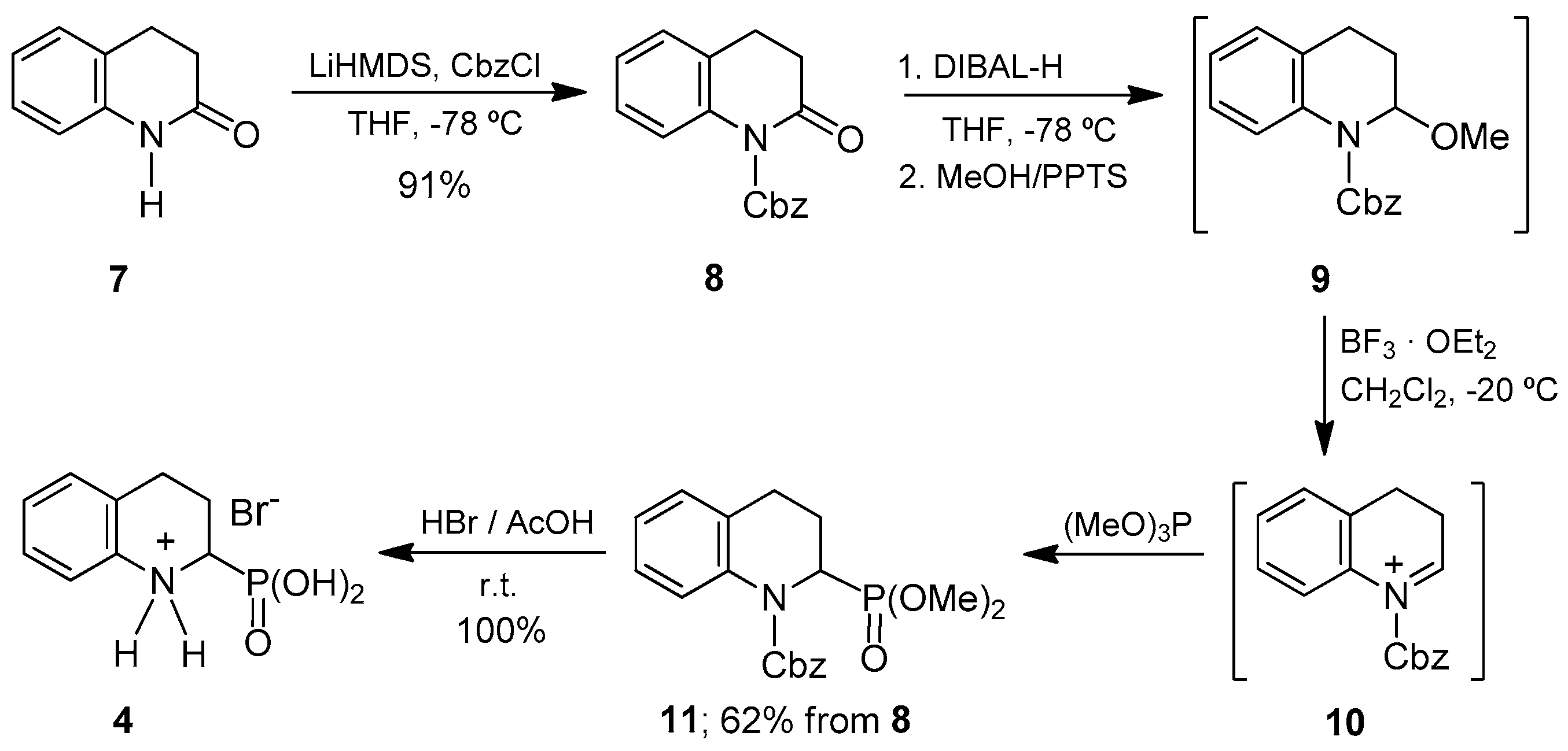 For the synthesis of 1,2,3,4-tetrahydroquinoline-2-phosphonic acid 4, we proposed the N-acyliminium ions as suitable precursors, considering that the well-known reduction of the carbonyl group of lactams such as the 3,4-dihydro-2(1H)-quinolinone 7, and their subsequent transformation into a N-acyliminium ion, is one of the methods that allows the incorporation of the phosphonate functionality into the α position of the nitrogen atom such as we have previously described [26,27,28]. These proposals prompted us to explore further application of the N-acyliminium strategy for the synthesis of the target compound. In this context, the commercially available 3,4-dihydro-2(1H)-quinolinone 7 was reacted with lithium bis(trimethylsilyl)amide (LiHMDS) as a base and benzyl chloroformate in THF at −78 °C, to obtain the N-Cbz-3,4-dihydro-2(1H)-quinolinone 8 in 91% yield. Reduction of the carbonyl group in 8 with diisobutylaluminium hydride (DIBAL-H) and subsequent reaction with methanol and catalytic amounts of pyridinium p-toluenesulfonate (PPTS), gave the methoxyaminal 9, which was treated immediately with trimethyl phosphite in the presence of BF3·OEt2, obtaining the dimethyl N-Cbz-1,2,3,4-tetrahydroquinoline-2-phosphonate 11 in 62% via the N-acyliminium ion 10 in 62% yield from 8. Treatment of this N-Cbz-protected phosphonate with a 33% solution of hydrogen bromide in acetic acid, afforded the 1,2,3,4-tetrahydroquinoline-2-phosphonic acid 4 as hydrobromide in quantitative yield (Scheme 1).