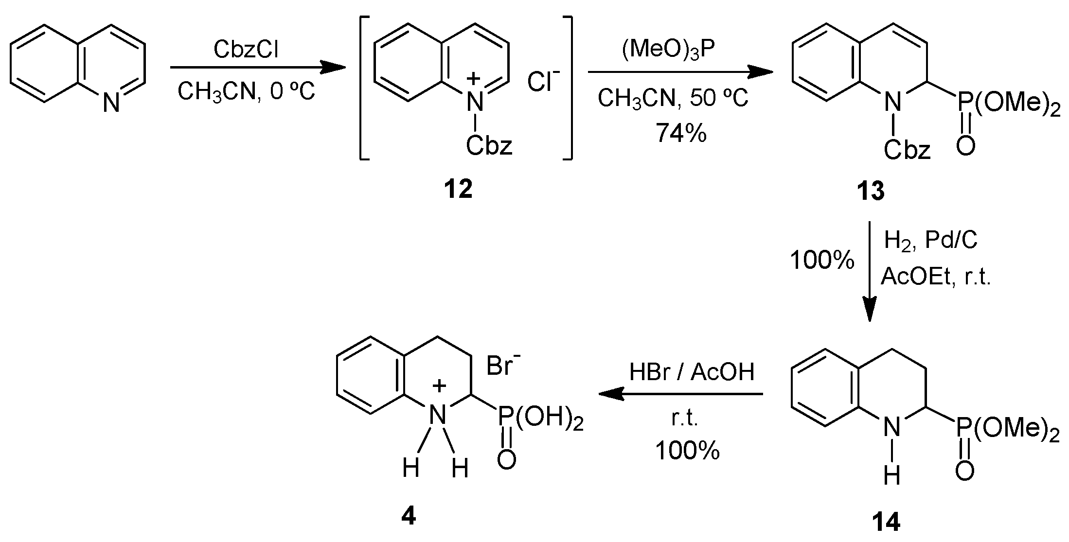 Based on this precedent, we decided to compare the efficiency of the N-acylquinolinium salts as intermediates in the synthesis of α-aminophosphonic acid 4. For this purpose, benzyl chloroformate was added to quinoline and the N-Cbz-quinolinium chloride formed 12 was reacted with trimethyl phosphite in acetonitrile at 50 °C, obtaining the dimethyl N-Cbz-1,2-dihydroquinoline-2-phosphonate derivative 13 in 74% yield from quinolone. The diphosphonylation products at the 2- and 4-positions of the quinoline ring were not detected. The regioselectivity observed in the addition of trimethyl phosphite to the N-acylquinolinium ion 12 may be attributed to the electron-withdrawing character of the benzyloxycarbonyl group, which increases the electrophilic nature of the carbon adjacent to the nitrogen atom. Additionally, the benzyloxycarbonyl group was selected for its easy incorporation and removal under mild conditions. Thus, the catalytic hydrogenation resulted in simultaneous removal of the Cbz group and reduction of the double bond at positions 3,4 to afford the α-aminophosphonate 14, which, by treatment with hydrogen bromide in acetic acid, gave the 1,2,3,4-tetrahydroquinoline-2-phosphonic acid 4 as hydrobromide. The latter two steps proceeded quantitatively and obviated the need for purification (Scheme 2).