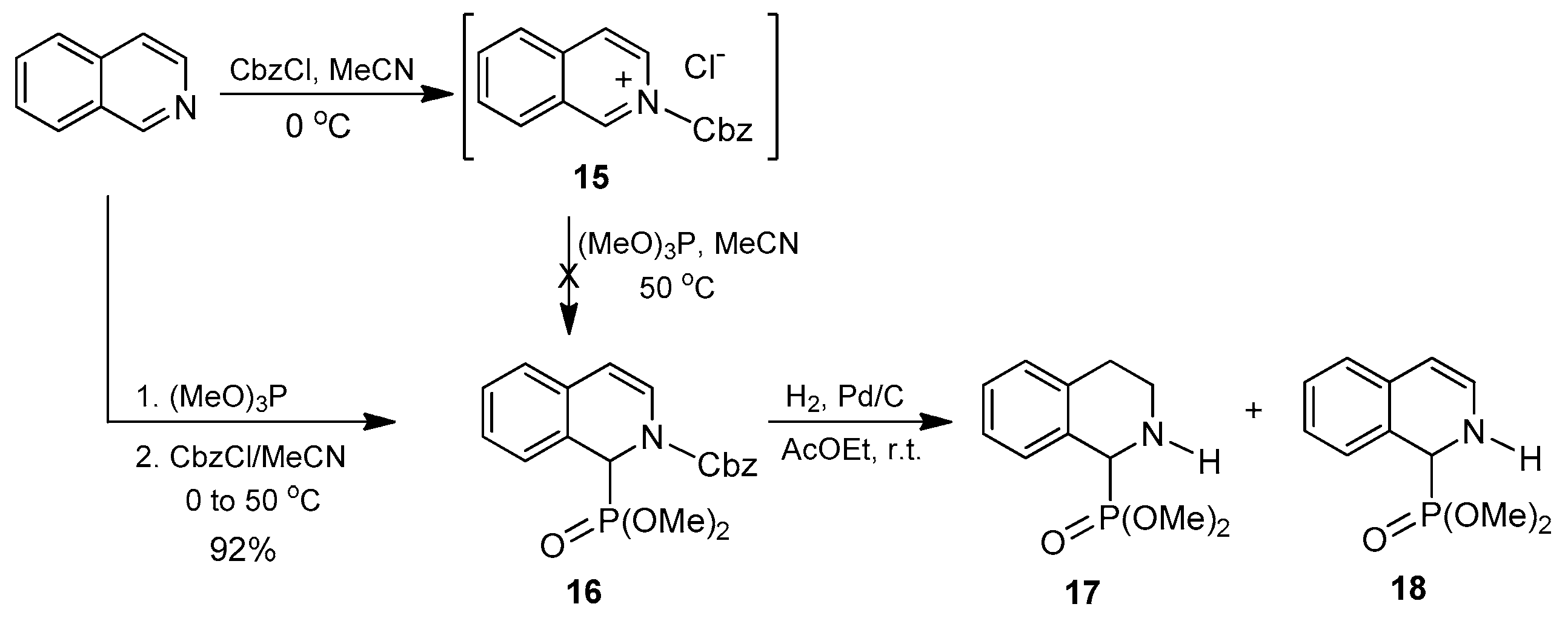 Thus, using the reaction conditions described above, the isoquinoline was reacted with benzyl chloroformate followed by the addition of trimethyl phosphite in acetonitrile at 50 °C. However, under these reaction conditions, the desired compound 16 was not obtained. It is noteworthy that during the addition of benzyl chloroformate to isoquinoline, a yellow solid was formed, which was later identified as the isoquinolinium salt 15. This compound remained unaltered upon addition of trimethyl phosphite so that the formation of the expected 1,2-dihydroisoquinoline-1-phosphonate 16 did not take place. We reasoned that if the trimethyl phosphite was present in the reaction medium before benzyl chloroformate was added, the isoquinolinium ion formed 16 would immediately react with it, thus preventing precipitation. To our delight, when the order of addition of these reagents was exchanged (that is, trimethyl phosphite prior to benzyl chloroformate), the dimethyl N-Cbz-1,2-dihydroisoquinoline-1-phosphonate 16 was obtained at 92% yield. In the next step, we carried out the catalytic hydrogenation of the double bond in 16 under an atmospheric pressure of hydrogen gas and using Pd/C as a catalyst, to generate the tetrahydroisoquinoline moiety. However, the Cbz group in 16 was readily eliminated at room temperature, whereas the double bond at positions 3,4 was only partially hydrogenated even after long reaction times. As a consequence, mixtures of the desired tetrahydroisoquinoline derivative 17 and the analogous dihydroisoquinoline 18 were obtained. Attempts to improve this result by changing the solvent as well as by increasing the reaction temperature or hydrogen gas pressure proved unsuccessful and a mixture of 17 and 18 was always obtained (Scheme 3).