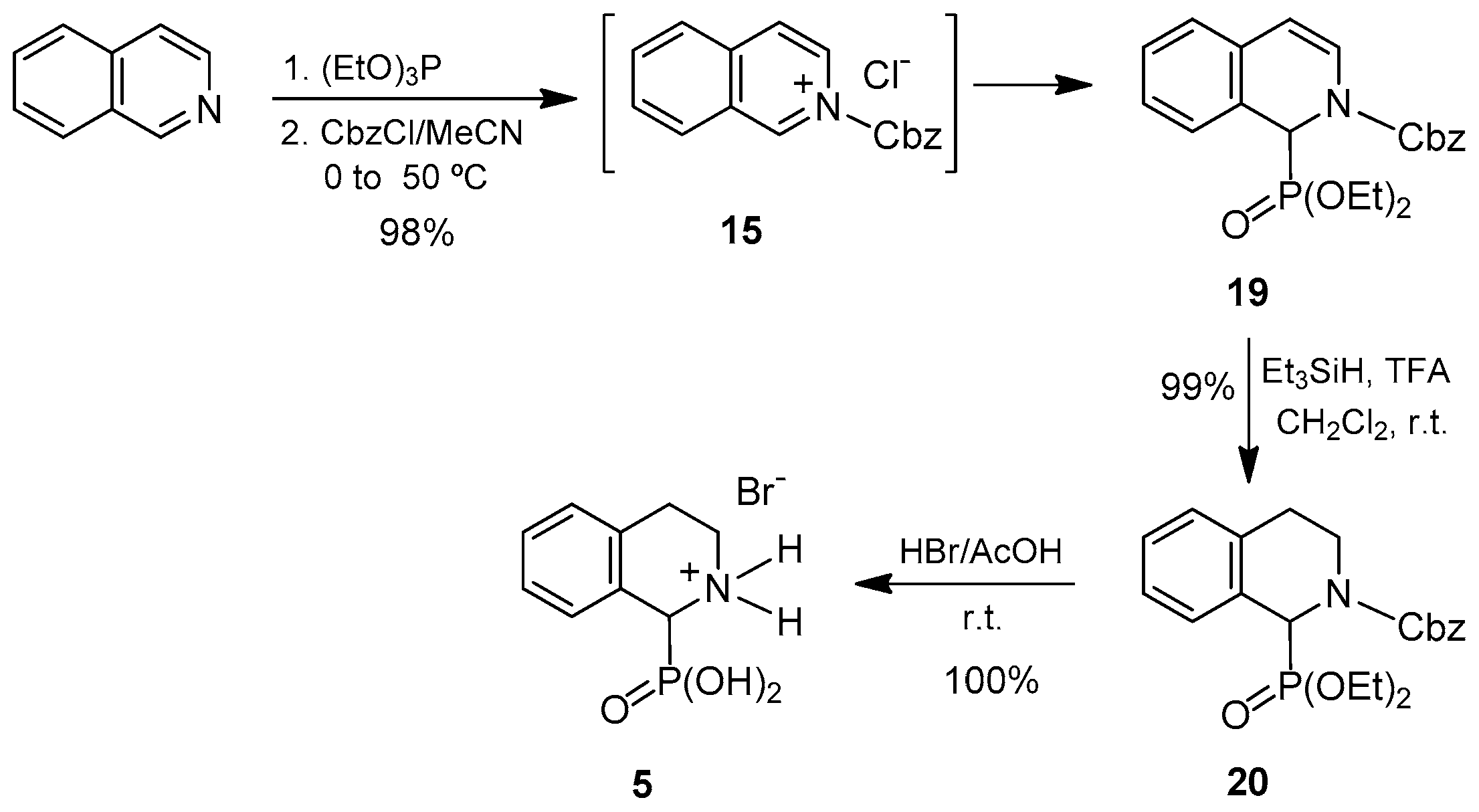 To circumvent this problem, we synthesized the compound analogous to 16 that bears the less acid-sensitive diethyl phosphonate group 19. A procedure identical to that established for the dimethyl derivative but using triethyl phosphite as the phosphorus source provided the desired diethyl N-Cbz-1,2-dihydroisoquinoline-1-phosphonate 19 in 98% yield from isoquinoline. Taking into account the fact that compound 19 can be considered not only as an N-acyl-α-aminophosphonate, but also as an enamide, we decided to perform the reduction of the double bond using trifluoroacetic acid and triethylsilane as the reducing agent, following the conditions described by Jacobsen et al. [51] for cyclic enamides. In this case, the diethyl N-Cbz-1,2,3,4-tetrahydroisoquinoline-1-phosphonate 20 was readily obtained in quantitative yield by reaction with triethylsilane and trifluoroacetic acid. Subsequent cleavage of the protecting groups in 20 by treatment with hydrogen bromide in acetic acid, afforded the 1,2,3,4-tetrahydroisoquinoline-1-phosphonic acid 5 as hydrobromide in quantitative yield. This compound was isolated in 97% overall yield from isoquinoline (Scheme 4).