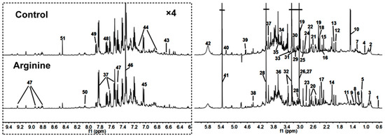 Typical one-dimensional 1H-NMR spectra obtained from representative rat urine samples of the control and arginine groups. The region of δ 6.2 to δ 9.5 was magnified four times compared with the corresponding region of δ 0.7 to δ 6.2 for clarity. A total of 51 metabolites were assigned. The chemical shifts and peak multiplicities of these metabolites are shown in Table 2.