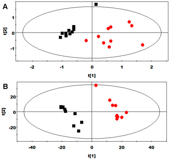 PCA score plots (R2X = 0.456 and Q2 = 0.141; (A) and PLS-DA score plots (R2X = 0.312, R2Y = 0.978, and Q2 = 0.873; (B) obtained through 1H-NMR spectra of 24 h urine samples from the arginine (red circles) and control (black squares) groups.