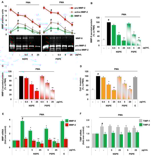 Both NSPE and PSPE reduced PMA-induced MMP-9 production by about 60% at 5 µg/mL, and lowered it at the control levels at 25 µg/mL. Moreover, both extracts at 5 µg/mL reduced the stimulated production of active MMP-2 and proMMP-2 by about 58% and 33%, respectively (Figure 1A). Active MMP-2 release was nullified at 25 µg/mL of NSPE and PSPE, thus resetting the active MMP-2/proMMP-2 ratio to the basal unstimulated condition. In agreement with anti-gelatinolytic activities, we showed that NSPE and PSPE inhibited in a concentration-dependent manner, both MMP-9 and MMP-2 protein release, at ELISA, with 5 µg/mL the lower effective inhibitory concentration (Figure 1B,C).