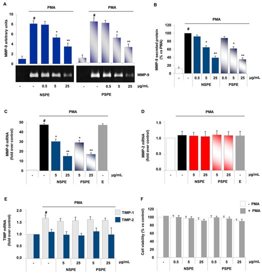U937 monocytes under inflamed conditions, mimicked by PMA treatment, expressed and released high levels of MMP-9 (Figure 2). At gelatin zymography, red grape skin polyphenol extracts attenuated the PMA-induced secretion of MMP-9 by U937 cells in a concentration-dependent manner (Figure 2A,B). Similarly to endothelial cells, 5 µg/mL was the lowest effective concentration of NSPE and PSPE able to reduce, by about 40%, the release of MMP-9 in inflamed monocytes. In accordance with MMP-9 release, levels of MMP-9 mRNA in PMA-treated cells were notably lowered by NSPE and PSPE as evidenced by qRT-PCR (Figure 2C). Noteworthily, in our experimental conditions, we found that PMA induced mainly MMP-9 in U937 monocytoid cells, whereas MMP-2 was not detectable at gelatin zymography or present at very low concentrations at qRT-PCR. MMP-2 mRNA remained not changed after PMA stimulation and/or treatment of NSPE and PSPE (Figure 2D). Moreover, PMA only induced TIMP-1 mRNA expression, but NSPE and PSPE did not significantly modify either TIMP-1 or TIMP-2 (Figure 2E). Cell treatment with NSPE or PSPE ranging from 0.5 to 25 µg/mL did not show significant decrease in viability of U937 cells at the MTT assay (Figure 2F), indicating that NSPE and PSPE inhibitory effects on MMP-9 gelatinolytic activity and expression was not due to cytotoxicity.