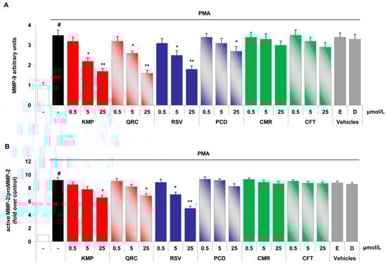 Differential effects of pure polyphenols on the stimulated release of gelatinases in endothelial cells. HUVEC were pre-treated with increasing concentrations of each polyphenol (0.5, 5 and 25 μmol/L) or vehicle (ethanol, E, 0.025% v/v; DMSO, D, 0.025% v/v) for 1 h and then stimulated with 20 nmol/L PMA, after which culture media were collected and analysed by gelatin zymography. Bar graphs show the quantification of MMP-9 levels (A) and MMP-2/pro-MMP-2 levels (B) of four independent experiments (mean ± SD). # p < 0.01 vs. control. * p < 0.05 and ** p < 0.01 vs. PMA alone.