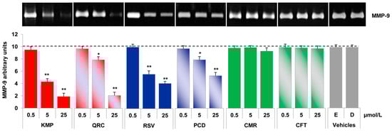 Similarly to endothelial cells, the PMA-stimulated MMP-9 release was prevented by pure polyphenols in monocytes (Figure 4). In particular, stilbenes as well as kaempferol and quercetin reduced MMP-9 release in a concentration-dependent manner, with 5 μmol/L as the lowest effective concentration. p-coumaric and caftaric acids were devoid of any significant effects.