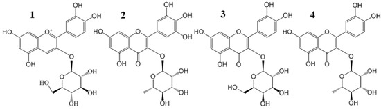 Chemical structures of four main flavonoid glycosides from Chinese bayberry pulp extract: cyanidin-3-O-glucoside (C3G) (1); myricetin-3-O-rhamnoside (M3R) (2); quercetin-3-O-galactoside (Q3Gal) (3); and quercetin-3-O-rhamnoside (Q3R) (4).