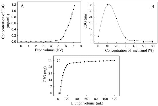 Dynamic leakage curve (A); gradient elution curve (B); and isocratic desorption curve (C) of C3G on a Sep-Pak®.