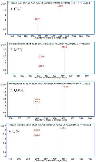The isolated compounds were further identified according to their retention time and UV absorption characteristics by HPLC-DAD analysis (Figure 3). Further structure identification of the purified compounds was confirmed by LC-MS2 (Figure 4). For peak 1, the ion at m/z 449.2 [M + H]+ suggested the molecular weight of C3G, and the ion at m/z 287.1 [M − 162]+ represented the glycoside cleavage of one hexoside residue from cyanidin aglycone. For peak 2, the ion at m/z 463.0 [M − H]− suggested the molecular weight of M3R, and the ion at m/z 316.0 [M − 146 − 2H]−, 317.0 [M − 146 − H]− represented the glycoside cleavage of one hexoside residue from myricetin aglycone. For peak 3 and peak 4, the ion at m/z 463.0 [M − H]− suggested the molecular weight of Q3Gal, the ion at m/z 447.1 [M − H]− suggested the molecular weight of Q3R, and the ion at m/z 300.0 [M − 162 − 2H]−, 301.0 [M − 162 − H]− resulted from the cleavage of a hexoside or deoxyhexoside residue from quercetin aglycone. Compared with the previous reports [13], the purified compounds could be confirmed subsequently by our LC-MS2 data.