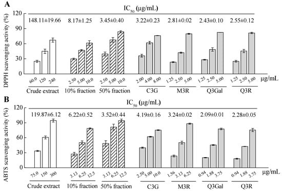 The antioxidant activity of crude extract, fractions and purified compounds from BQ pulp were evaluated by using both 2.2-diphenyl-1-picrylhydrazyl (DPPH) and 2.2′-azinobis (3-ethylbenzothiazoline -6-sulfonic acid) diammonium salt (ABTS) free radical scavenging assays. Apparent dose-dependent antioxidant activities were observed for all the samples with serial concentrations tested (Figure 5). The IC50 value of DPPH scavenging activity of the crude extract was 148.11 μg/mL, while the IC50 values for the 10% fraction and 50% fraction were 8.17 μg/mL and 3.45 μg/mL, respectively, for the same assay. For the four purified compounds, higher DPPH scavenging activities were found than those of the crude extract or 10% or 50% fractions, since the IC50 values for C3G, M3R, Q3Gal, and Q3R were 3.22, 2.81, 2.43, and 2.55 μg/mL, respectively (Figure 5A). The data from the ABTS scavenging assay showed similar results with the DPPH assay (Figure 5B). Therefore, these four flavonoid glycosides may all contribute to the antioxidant activity of the BQ pulp crude extract.