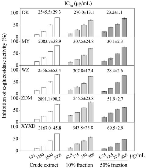 Apparent dose-dependent α-glucosidase inhibitory activities were observed for six bayberry cultivars with serial concentrations tested (Figure 7). The crude extracts of six bayberry cultivars, i.e., BQ, Dongkui (DK), Muye (MY), Wuzi (WZ), Zaodamei (ZDM), Dayexidi (DYXD), demonstrated α-glucosidase inhibitory activity with IC50 values ranging from 2083.7–3167.0 μg/mL and the 10% fractions with IC50 values ranging from 245.5–343.8 μg/mL. Furthermore, 50% fractions of six cultivars showed the potent α-glucosidase inhibitory activity with IC50 values ranging from 23.2–69.5 μg/mL, all of which were better than that of the positive control acarbose.