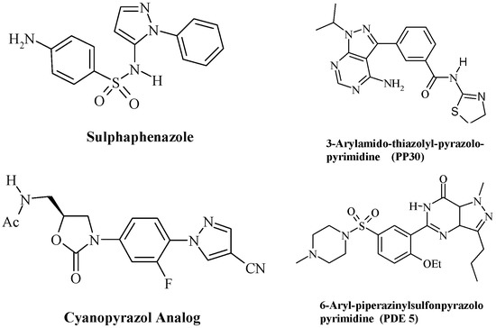 Antimicrobial resistance has become a serious health problem, so the increased rate of microbial infections and resistance to antimicrobial agents [1] prompted us to identify a novel structure that may be used in designing new, potent, and broad spectrum antimicrobial agents. Pyrazoles are one of the most common pharmaceutically active compounds, and have attracted much attention due to their broad spectrum of biological activities such as anti-inflammatory [2,3], COX inhibitory [4], hypoglycemic [5], CDK2/Cyclin A [6], p38 MAP kinase [7], and antidepressive activities [8], and have been widely used in biopharmaceutical and pesticides. Pyrazole plays a unique role in drug discovery programs. Pyrazole derivatives are an important class of heterocyclic compounds showing a wide range of biological activities such as antimicrobial [9,10,11] (Figure 1).