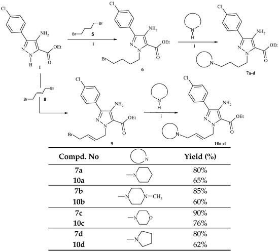 The treatment of ethylcarboxylate (1) with an excess of 1,4-dibromobutane (5) in the presence of K2CO3 in DMF at 25 °C for 5 h obtained crude ethyl-4-amino-1-(4-bromobutyl)-3-(4-chlorophenyl)-1H-pyrazole-5-carboxylate (6). Similarly, ethyl 4-amino-1-[(2E)-(4-bromobut-2-en-1-yl)-3-(4-chlorophenyl)-1H-pyrazole-5-carboxylate (9) was prepared from (1) and (E)-1,4-dibromobut-2-ene (8). Compounds (6) and (9), when reacted separately with different heterocyclic secondary amines, gave the corresponding desired products, (7a–d) and (10a–d), respectively, in good yields (Scheme 2).