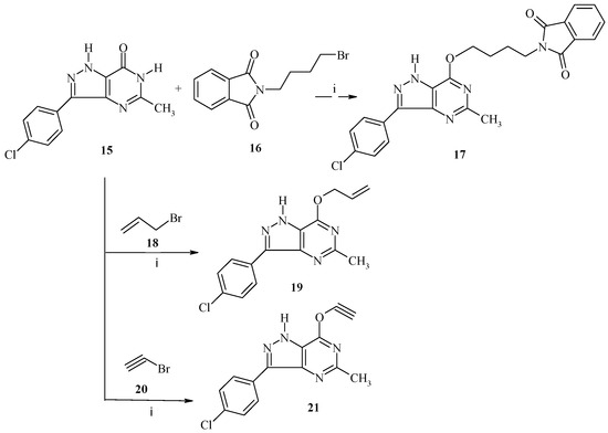 Reaction of 3-(4-chlorophenyl)-5-methyl-1,6-dihydro-7H-pyrazolo[4,3-d]pyrimidin-7-one (15) with 2-(4-chlorobutyl)isoindoline-1,3-dione (16), allyl bromide (18) and bromoethyne (20); (i) K2CO3, DMF, 25 °C, 10 h.