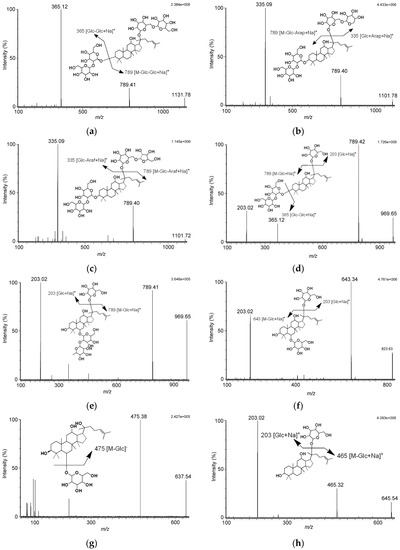 - Song, F.; Liu, Z.Q.; Liu, S.Y.; Cai, Z.W. Differentiation and identification of ginsenoside isomers by electrospray ionization tandem mass spectrometry. Anal. Chim. Acta 2005, 531, 69–77. [Google Scholar] [CrossRef]