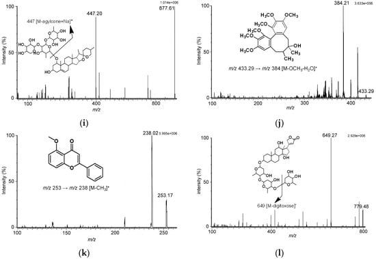 Product ion mass spectra of ten marker compounds: (a) ginsenoside Rb1; (b) ginsenoside Rb2; (c) ginsenoside Rc; (d) ginsenoside Rd; (e) ginsenoside Re; (f) ginsenoside Rg1; (g) ginsenoside Rh1; (h) ginsenoside compound K; (i) ophopogonin D; (j) schizandrin; and the internal standards (k) 5-methoxyflavone and (l) digoxin.