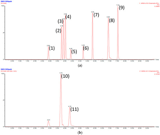 Selective reaction monitoring (SRM) chromatograms of the analytes. (a) Positive mode: (1) Ginsenoside Re and Rg1, (2) Ginsenoside Rb1, (3) Ginsenoside Rc, (4) Ginsenoside Rb2, (5) Ginsenoside Rd, (6) 5-methoxyflavone, (7) Schizandrin, (8) Ophiopogonin D, (9) Ginsenoside Compound K; (b) Negative mode: (10) Digoxin, (11) Ginsenoside Rh1.