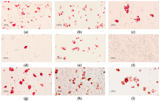 Microscopy photographs with Congo red staining. Light microscope photographs of Sheng-Mai-San (a–e) products of brands A–E, respectively; (f) cornstarch; (g) raw herbal powder; (h) mixture cornstarch/raw herbal powder = 1:1; (i) mixture raw herbal powder/brand A SMS herbal pharmaceutical product = 1:1 ( magnification 100×). Scale bar is 200 μm.