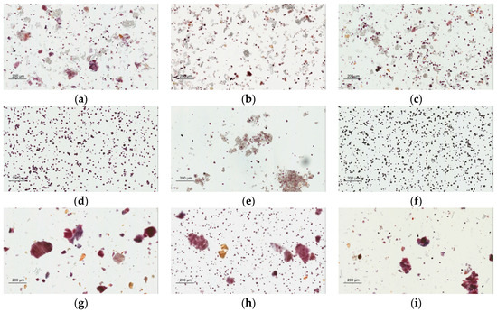 Microscopy photographs with iodine solution staining. Light microscopy photographs of (a–e) SMS herbal pharmaceutical products of brands A–E, respectively; (f) cornstarch; (g) raw herbal powder; (h) mixtrure cornstarch/raw herbal powder = 1:1; (i) mixture raw herbal powder/brand A SMS herbal pharmaceutical product = 1:1 (magnification 100×). Scale bar is 200 μm.
