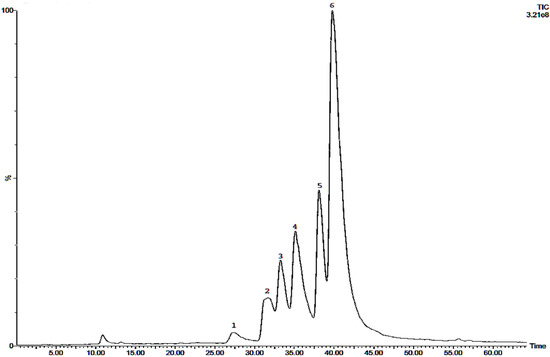 HPLC-MS total ion current chromatogram of a methanol extract of Coptis chinensis. Peaks: 1: Tetradehydroscoulerine / tetrahydrocheilanthifolinium (m/z = 322); 2: columbamine (m/z = 338); 3: epiberberine (m/z = 336); 4: coptisine (m/z = 320); 5: palmatine (m/z = 352); 6: berberine (m/z = 336).