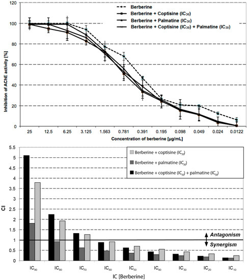 AChE inhibitory effect and synergistic effects of berberine in combination with coptisine and palmatine. The combination of berberine with other alkaloids inhibits ACh stronger than berberine alone (top); The combination index (CI) increases with higher concentrations of berberine (bottom). Data is shown as mean ± SD from three individual experiments, each carried out in triplicates.