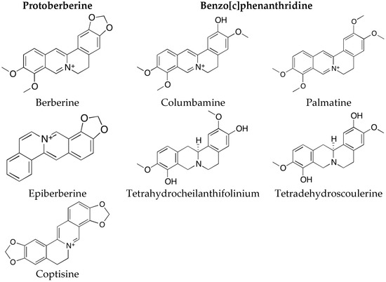 - Schmeller, T.; Latz-Bruning, B.; Wink, M. Biochemical activities of berberine, palmatine and sanguinarine mediating chemical defence against microorganisms and herbivores. Phytochemistry 1997, 44, 257–266. [Google Scholar] [CrossRef]