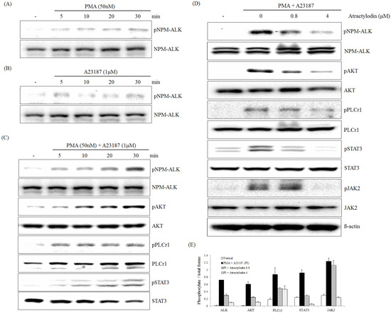Effect of atractylodin on the PMA plus A23187-induced activation of the NPM-ALK pathway in HMC-1. HMC-1 was treated with PMA at the indicated times for 50 nM and phospho (Tyr646)- and total NPM-ALK were detected by immunoblot analysis (A); HMC-1 was treated with A23187 at the indicated times for 1 μM and phospho (Tyr646)- and total NPM-ALK were detected by immunoblot analysis (B); HMC-1 was treated with PMA plus A23187 at the indicated times for 50 nM and 1 μM and phospho- and total NPM-ALK, AKT, PLCγ1 and STAT3 were detected by immunoblot analysis (C); HMC-1 was treated with the indicated concentrations of atractylodin for 0.5 h prior to being incubated with PMA (50 nM) plus A23187 (1 μM) for 0.5 h and phospho and total NPM-ALK, AKT, PLCγ1, JAK2, and STAT3 were detected by immunoblot analysis as described in Materials and Methods (D); The immunoblot signals were quantified using Molecular Analyst/PC densitometry software (Bio-Rad). Densitometric analysis of phosphorylated isoforms is reported (E).