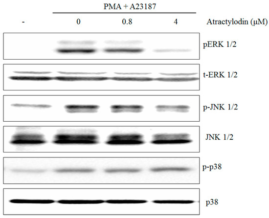 The stimulation of HMC-1 cells with PMA plus A23187 resulted in an increased phosphorylation of all three types of MAPKs, p38, JNK, ERK, after 0.5 h post-treatment. Atractylodin apparently suppressed phosphorylation of ERK1/2 and JNK1/2, but not the phosphorylation of p38 in HMC-1 cells (Figure 3).