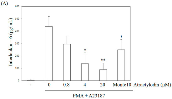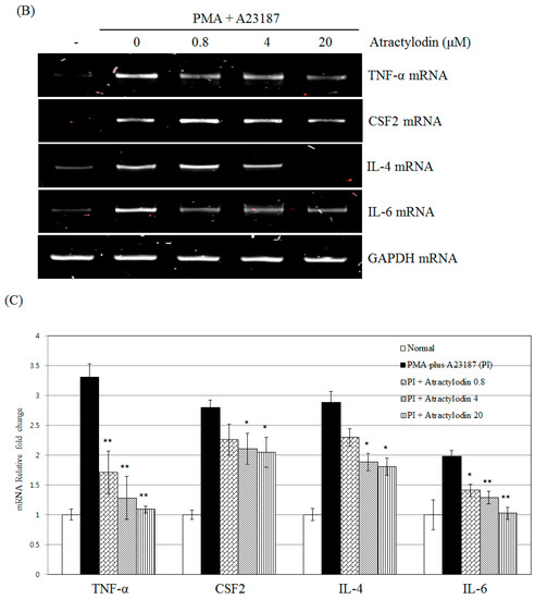 To evaluate the effects of atractylodin on the production of IL-6, we pretreated cells with this compound before stimulation for 24 h, and then analyzed the samples by ELISA. Atractylodin displayed an inhibitory effect on IL-6 production in stimulated HMC-1 cells with an IC50 value of 6.32 μM (Figure 4A). Montelukast was used as a positive control since it is a known inhibitor of mast cell activation [25]. A cell viability test following treatment of the human mast cells with these compounds revealed no toxicity up to 20 μM (data not shown). The effect of atractylodin on TNF-α, CSF2, IL-4, and IL-6 mRNA expression induced by PMA plus A23187 was examined using reverse transcription polymerase chain reaction (RT-PCR) and qRT-PCR. Treatment with PMA plus A23187 increased the mRNA expression of TNF-α, CSF2, IL-4 and IL-6, whereas atractylodin pretreatment suppressed this increase. Hence, atractylodin was found to potently inhibit TNF-α, CSF2, IL-4, and IL-6 production in the stimulated HMC-1 cells (Figure 4B,C).
