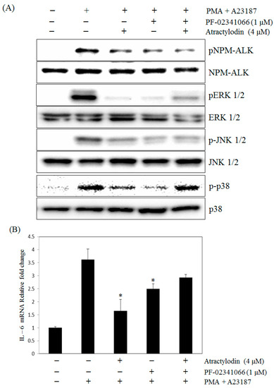 In this study, we determined whether or not PMA plus A23187 were able to stimulate the NPM-ALK pathway. Additionally, atractylodin was evaluated for its inhibitory effect on IL-6 production and activation of the NPM-ALK and MAPK pathways in PMA/A23187-induced HMC-1 cells.