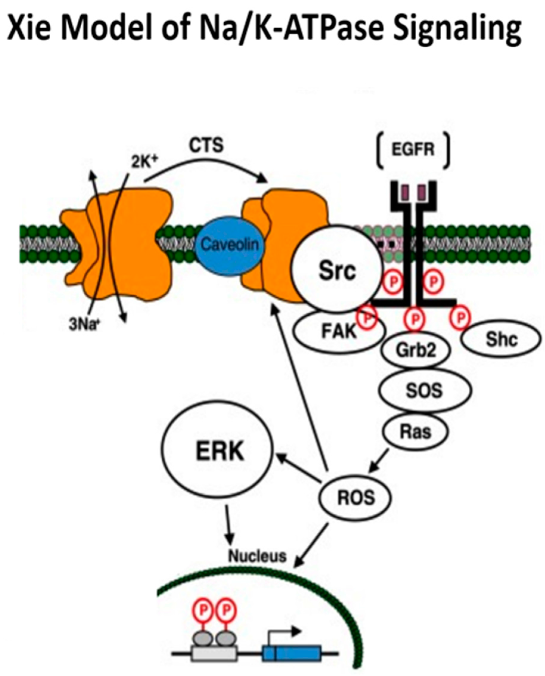 The Xie model for the Na/K-ATPase signaling function was derived from difficulties explaining signaling with the ionic model, along with experimental observations regarding reactive oxygen species (ROS) and tyrosine kinase activities being critical to such signaling. This model proposed that the caveolar Na/K-ATPase α1 subunit serves as a negative regulator of Src and that during conformational changes in α1 induced by CTS or oxidation, Src is allowed to become active and trigger a signal cascade, which involves the generation of ROS. The α1 subunit of the Na/K-ATPase binds Src and appears to maintain it in an inactive state. However, binding CTS appears to alter the Na/K-ATPase structure allowing Src to become activated, which, in turn, transactivates the EGFR, and begins the signal cascade, which causes increases in ROS.