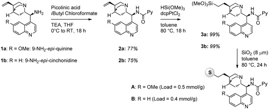 In this work, we prepared five solid supported chiral picolinamides derived from cinchona alkaloid primary amines using silica and polystyrene as supporting material. The general strategy to prepare silica supported catalysts involved the functionalization of the double bond of the quinuclidine ring with a trimethoxysilyl derivative, necessary to graft onto commercially available silica nanoparticles. The synthesis of catalysts A and B is illustrated in Figure 1. The primary amine derived from cinchona alkaloids (1a or 1b) was converted into the corresponding picolinamide by reaction with picolinic acid and isobutyl chloroformate in the presence of triethylamine (TEA) in THF. The double bonds of compounds 2a and 2b were then quantitatively converted into trimethoxysilyl derivatives 3 by reaction with trimethoxysilane HSi(OMe3) using dcpPtCl2 as a catalyst for the hydrosilylation reaction. Final grafting was performed in the presence of commercially available SiO2 nanoparticles (Apex Prepsil Silica Media 8 μm) in toluene at 80 °C for 24 h. Catalyst loadings were determined by weight difference.