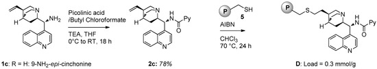 For the preparation of polystyrene supported catalyst D an alternative strategy was employed (Figure 3): chiral picolinamide 2c derived from 9-amino-epi-cinchonine was subjected to radical initiated thiol-ene coupling (initiated by AIBN) with solid 5, a polystyrene bearing a thiol functionality [22]. The loading of D (0.3 mmol/g) was determined by weight difference.