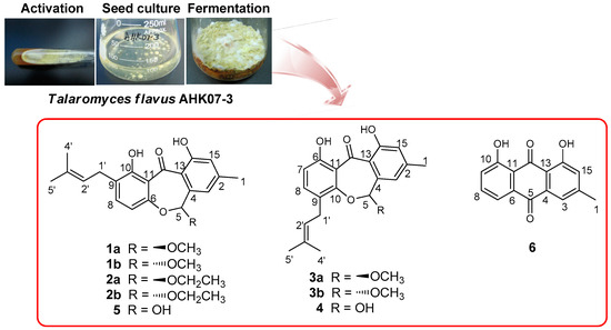 The strain AHK07-3 was isolated from the soil, collected at the wetland of Ahongkou, Sinkiang Province, China. The strain was identified as Talaromyces flavus based on the morphological characters and gene sequence analysis. The ribosomal internal transcribed spacer (ITS) and the 5.8S rRNA gene sequences (ITS1-5.8S-ITS2) of the strain have been deposited at GenBank as KX011167. The fungus was cultured on slants of potato dextrose agar at 25 °C for 5 days. Agar plugs were used to inoculate four Erlenmeyer flasks (250 mL), each containing 100 mL of potato dextrose broth. Four flasks of the inoculated media were incubated at 25 °C on a rotary shaker at 200 rpm for 5 days to prepare the seed culture. Fermentation was carried out in 20 Erlenmeyer flasks (500 mL), each containing 70 g of rice. Distilled H2O (105 mL) was added to each flask, and the rice was soaked overnight before autoclaving at 120 °C for 30 min. After cooling to room temperature, each flask was inoculated with 5.0 mL of the seed culture containing mycelia and incubated at room temperature for 50 days.