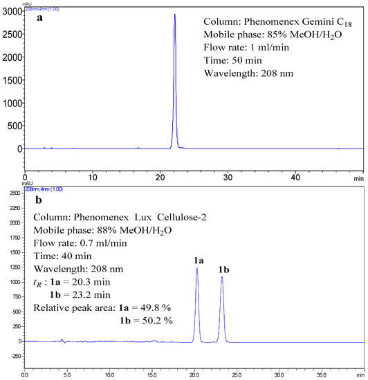 HPLC analysis of 1. a: the analysis of 1 on routine ODS HPLC; b: the analysis of 1 on chiral HPLC.