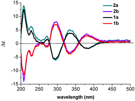 Since 1 and 2 coexist in the same strain, 2 was also a racemic mixture, and it displayed two peaks in a Phenomenex Lux Cellulose-2 chiral column (Figure S1, Supplementary Materials). Therefore, (+)-2a (tR = 22.6 min) and (−)-2b (tR = 26.6 min) were isolated from 2 by a Phenomenex Lux Cellulose-2 chiral column using CH3OH/H2O (88/12, v/v) as eluent at a flow rate of 0.7 mL/min. The ECD spectra and values of 2a ( +27.4 (c 0.5, CHCl3)) and 2b ( −26.8 (c 0.5, CHCl3)) showed their enantiomeric relationship. Since the ECD data of 2a were similar to that of 1a (Figure 5), the absolute configuration of 2a was determined as 5S (Figure 5). The similar observation was found between 2b and 1b. Therefore, the absolute configurations of 2a and 2b were assigned as 5S and 5R, respectively.