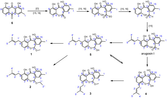 Based on the structural features of compounds 1–6 and literature investigation, a plausible biosynthetic pathway of them was proposed (Scheme 1). Chrysophanol (6) undergoes oxidization [17,18], ring-cleavage [17,18], reduction [17,18], and isoprentenylation to yield arugosin I [17], which may be the precursor of arugosin N (4) and 1,6,10-trihydroxy-8-methyl-2-(3-methyl-2-butenyl)-dibenz[b,e]oxepin-11(6H)-one (5). Then, arugosin K (1) and arugosin L (2) may originate from 5 by methylation and ethylation, respectively. Arugosin M (3) may originate from 4 by methylation.