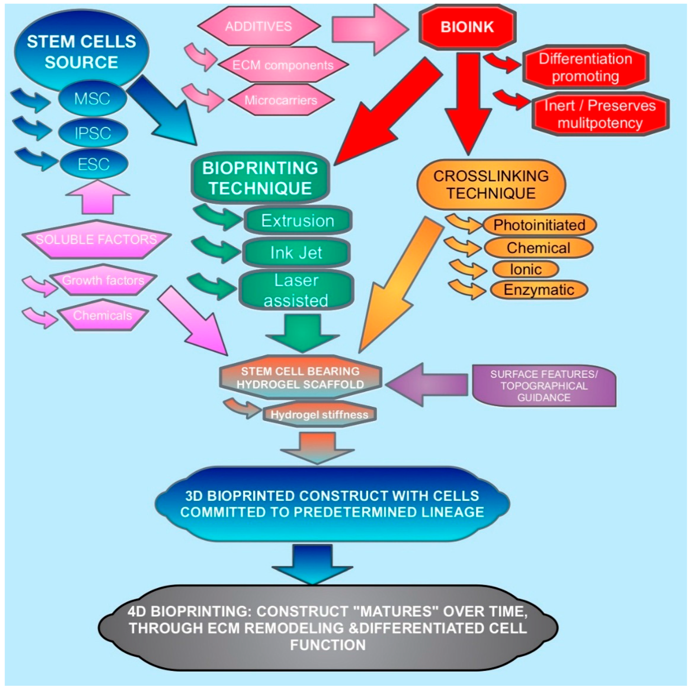 Diagram demonstrating interplay of the factors and variables involved in the 3D bioprinting and differentiation of stem cells as discussed in this article.
