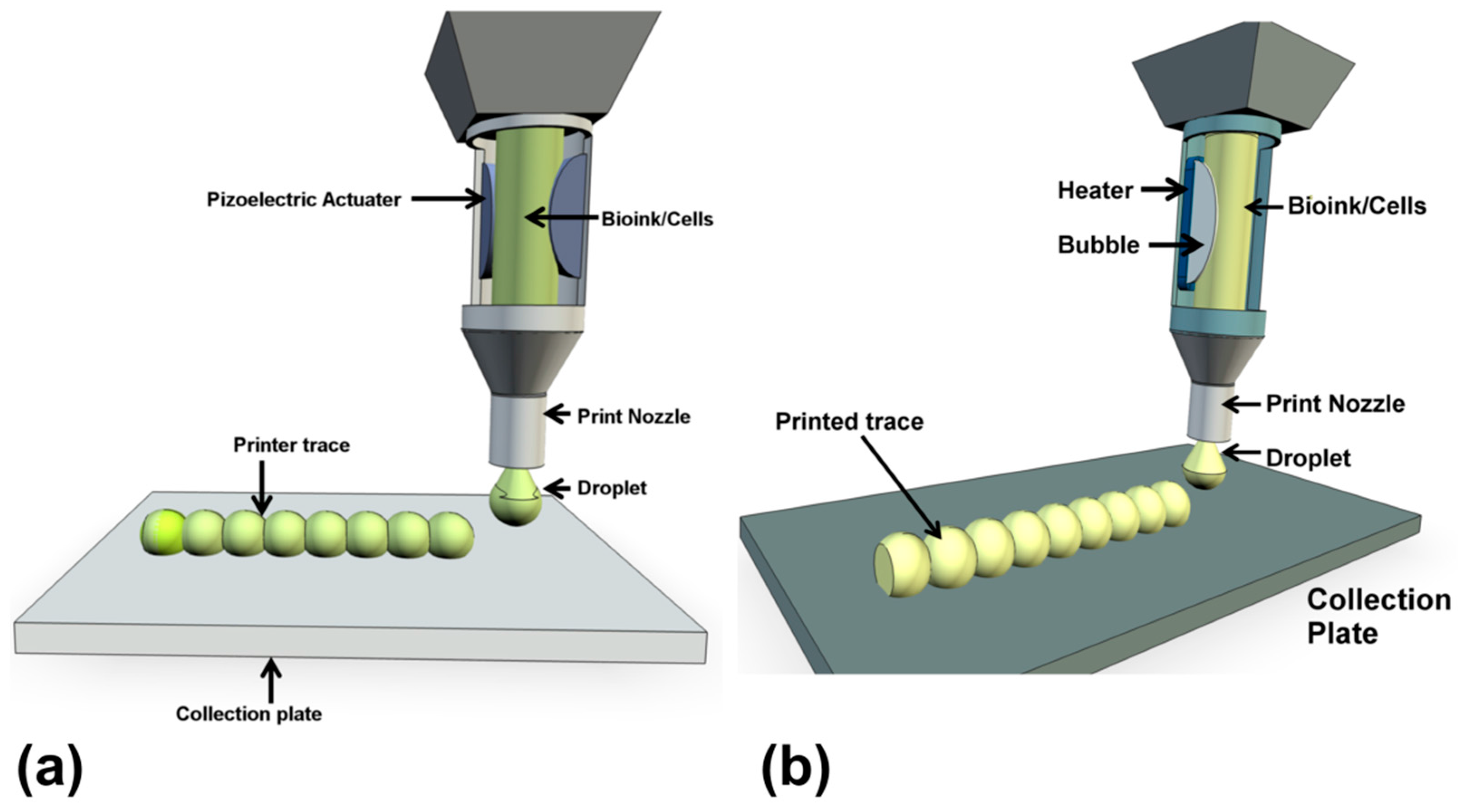A representation of inkjet bioprinting of stem cell. Droplets of a stem cell bearing bioink are formed from the reservoir by the action of a piezoelectric (a) or thermal actuator (b) to be deposited on a collection plate.