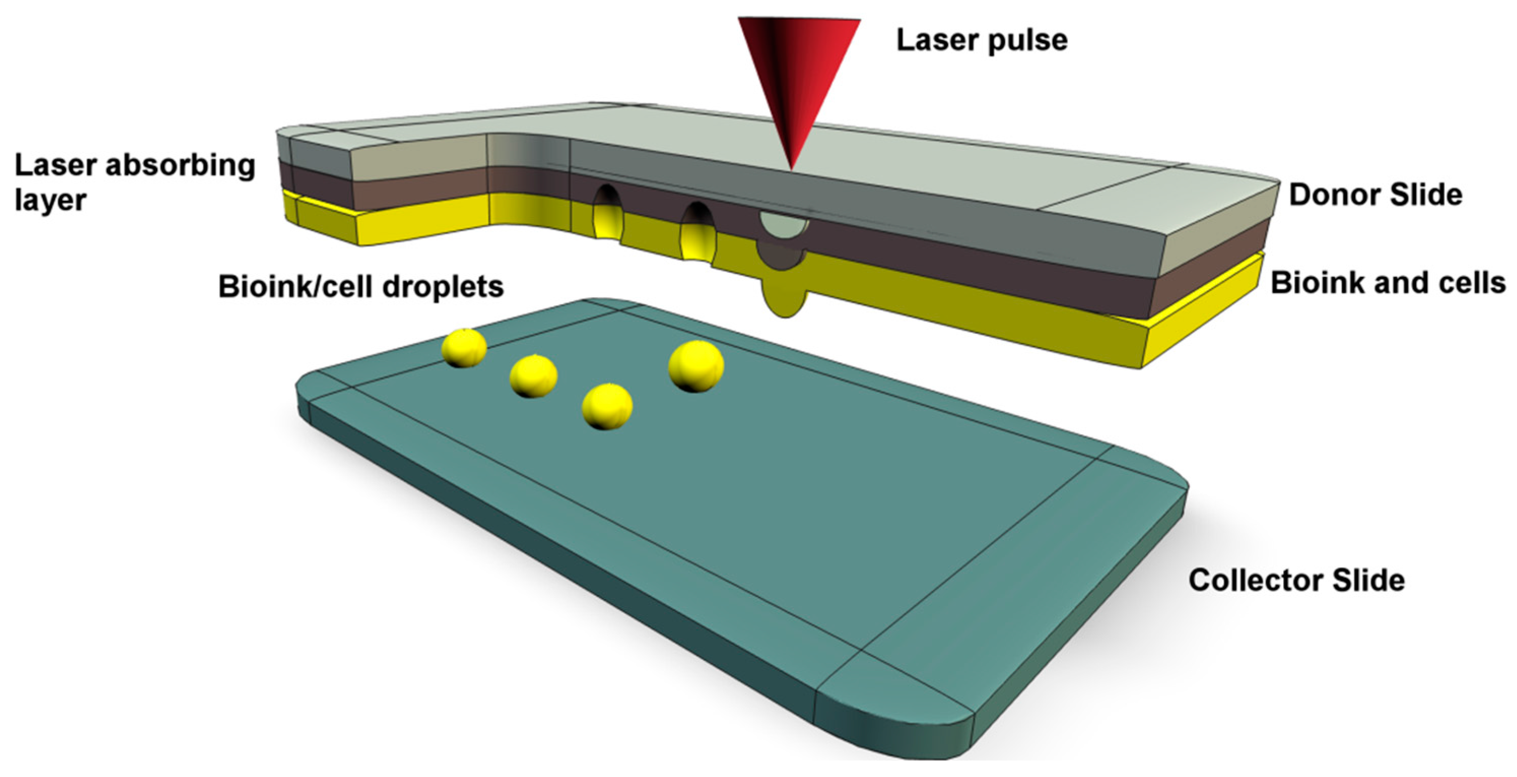 This approach was developed from laser direct write and laser induced transfer technologies. The method functions by focused laser stimulation of the upper surface of an energy absorbing sacrificial layer. A cell containing biopolymer or bioink is coated onto the lower surface of the energy absorbing layer. Laser stimulation vaporizes the sacrificial material, generating a pressure bubble that propels a bioink droplet on to a collection/receiving substrate with precision placement (Figure 4) [19,22].